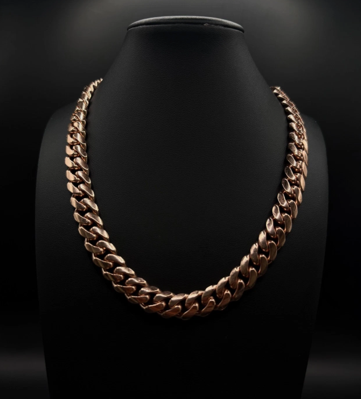 Bold and beautiful Miami Cuban Link Chain made of solid 925 sterling silver, featuring a stunning Rose Gold Tone finish that gives it a luxury, eye-catching look. This chain has a heavy, solid feel with thick Cuban links and a high-polish shine.